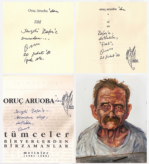 Zafer Yalçınpınar: Aruoba’nın yayımlanan son yazısının gezi parkı direnişi zamanında Tayyip Erdoğan’a ithafen kaleme aldığı açık mektup (Cumhuriyet Gazetesi, 17 Ağustos 2013) olduğunu tahmin ediyorum. Fakat, Usta Defteri’nde aktardığım görüşme sırasında (Mayıs 2011’de) “Bülent Arınç, Şevket Kazan ve Kasaba Avukatlığı” başlıklı bir yazıyı sürdürdüğünü ancak tamamlayamadığını ifade etmişti.